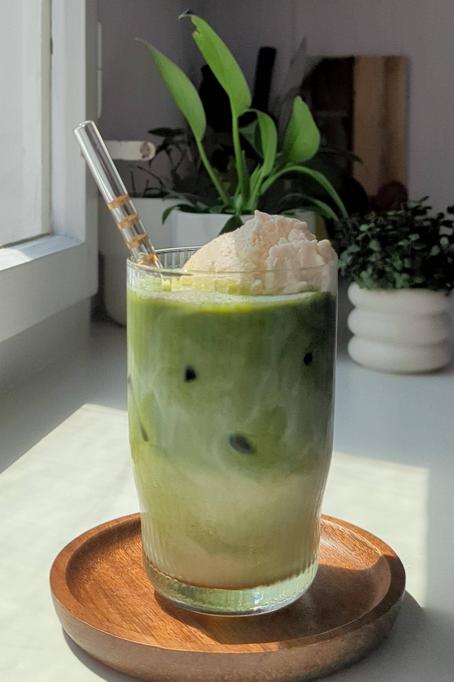 Zubereiteten Matcha hinzufügen und Vanilleeis vorsichtig in das Glas geben. Mit einem Strohhalm genießen!