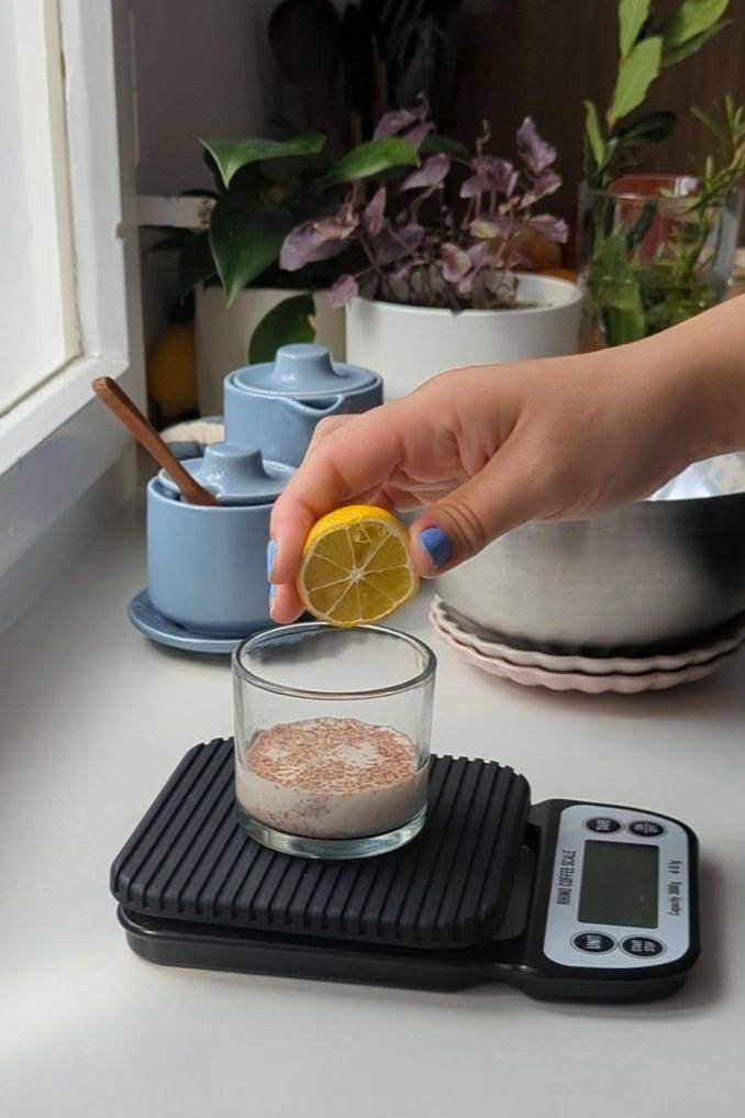 In einer kleinen Schüssel die geschroteten (idealerweise im Mixer fein gemahlen) Leinsamen und ein Viertel der Hafermilch vermengen. Etwas Zitronensaft hinzugeben und beiseite stellen, bis die Mischung andickt. Das ist unser Ei- und Buttermilch-Ersatz zugleich.